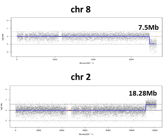CNV-seq identified terminal deletion/duplication events at the end of chromosomes 2 and 8, indicating an balanced translocation.